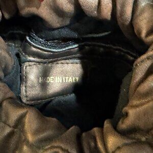 • Leather (Bronze) drawstring closure with leather strap, adorned with two red velvet roses