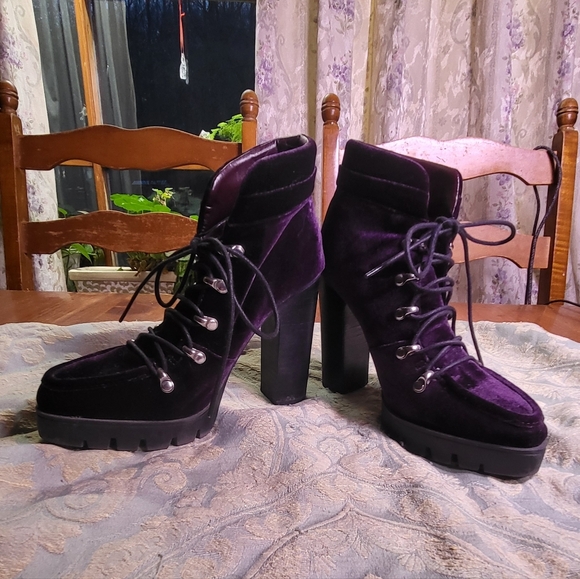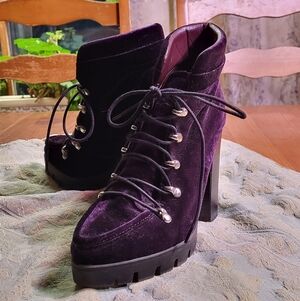 Step out in style with these elegant velvet platform ankle boots. Featuring a rich purple hue, these boots are perfect for making a statement. The lace-up design adds a touch of sophistication to any outfit. From Report Signature. Almond toe. Excellent outer condition with a little wear inside.