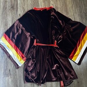 Our luxurious robe with square bell sleeves in our softest stretch velvet. Featuring contrasting collar, waist tie and stripes on the sleeves. The underarms have a traditional underarm opening and... this robe has pockets! One size fits most Length: 34"