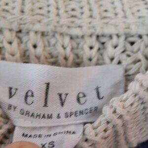 This Velvet by Graham & Spencer sweater channels a cozy French coastal vibe with its chunky horizontal navy and ivory stripes. The open-weave cotton blend adds rich texture and breathability, while the cropped silhouette keeps it fresh and easy to style. Ribbed crewneck. Long sleeves. Size XS. Made in China. 54% nylon, 46% cotton.
