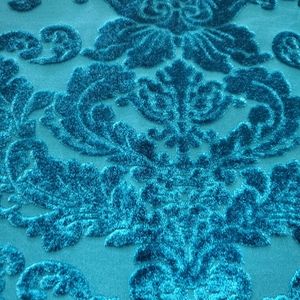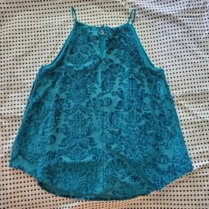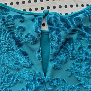 Sleeveless teal blouse with velvet Damask pattern on it. It tapers out towards the waist for a loose, flowing fit. It also has an inner lining.