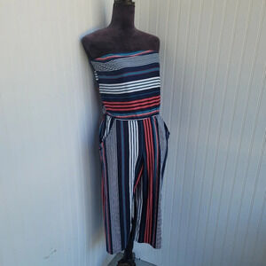 Velvet Torch Jumpsuit Women Strapless Tie Waist Blue Red Stripes Stretch Sz L