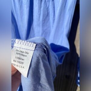 A cute blue dress with smocked neckline with colorful threading. It can be worn off shoulder or up. Features long sleeves with ruffled cuffs.