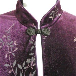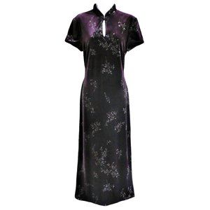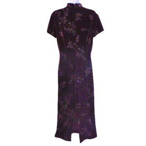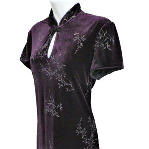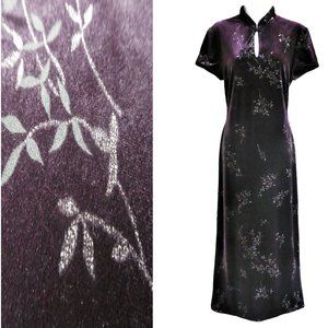 Velvet Vintage Maxi Cheongsam Dress Deep Purple Botanical Sparkly Silver & Gray. Stretchy. Band Mandarin Collar. Single Black Frog Closure with Peekaboo Cutout. Back Slit. Poly Spandex Blend. Tagged Size 12. Measures Modern US Size Medium to Large.