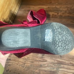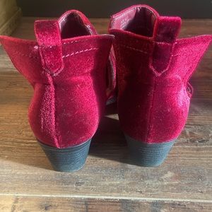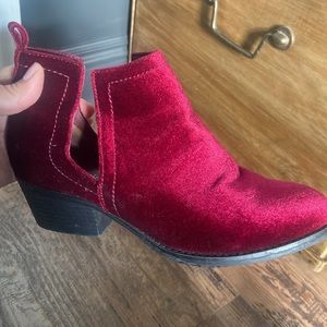 One colored, velvet booties. Look cute with dresses & pants.