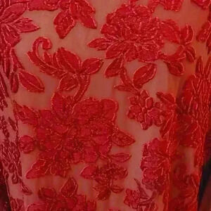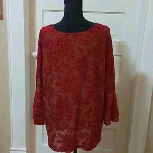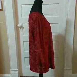Tunic fit with bell sleeves. It is a deep red color but the photos make it look lighter.