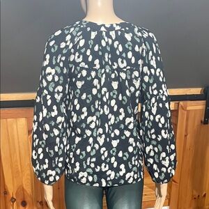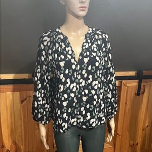 Elegant blouse with a bold black and white pattern. Features a relaxed fit and long sleeves.