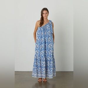 Velvet by Graham & Spencer Joanna Dress Blue One-Shoulder Tie Tiered Maxi Size S