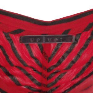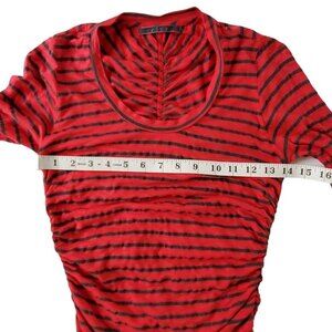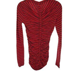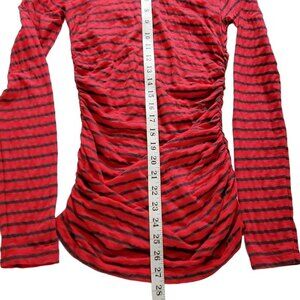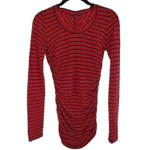 Velvet by Graham & Spencer Striped Rouched Long Sleeve T-Shirt. Red with dark, charcoal grey stripes. Ruched sides and back.