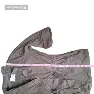 "This feminine styled cotton light weight utility jacket from Velvet by Graham and Spencer is a welcome spin on the classic army jacket. Design elements include button epaulettes, flap pockets on the front and button up ties at the sleeves. The drawstring waist adds extra style to this relaxed, military-inspired jacket. Fabric is 100% cotton. Machine wash inside out. Tumble dry low. Measures 27 3/4" long from the shoulder." -vintage fringe.