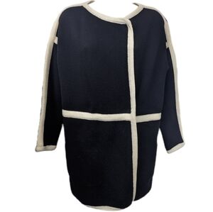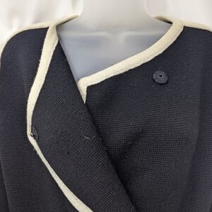 This sweater jacket is in gently used condition. It is 100% wool. Light pilling throughout. The buttons are a snap style. The flap is an asymmetrical style. It is a heavier weight material. Please see photos for details.
