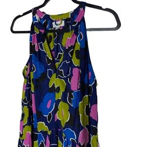 Vibrant floral sleeveless dress. Features blue, green, and pink colors. No flaws. Size XS. Armpit to Armpit 20 inches. Shoulder to Hem 42 inches.