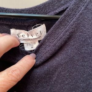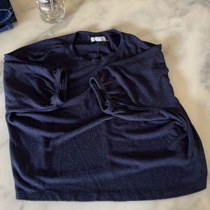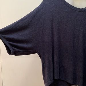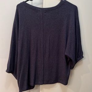 Navy blue beautifully draped piece. Hits just below waist to allow for French tuck or looks equally flattering untucked. Can fit probably up to a large. I'm a small and it fits me but a little big, so this could be worn by many sizes, depending on if you like an oversized fit 3/4 length sleeves with elastic on ends for a draping effect super soft, as to be expected from Velvet. I purchased from store on Abbott Kinney in Venice CA.