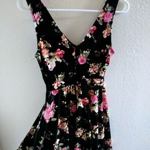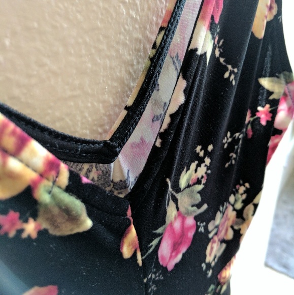 This unlined black velvet dress features a floral print in a mix of pink and muted roses. It's a stretch over-the-head dress that's great for layering, dressed up or down.