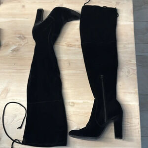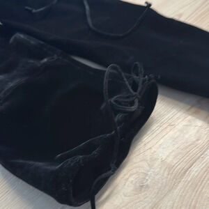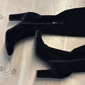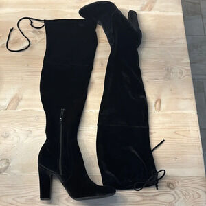 Black Velvet over the knee boots either ties to adjust to fit on thigh. 4” heel. Never worn.
