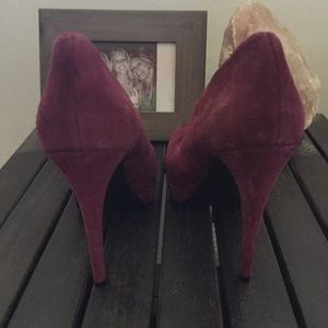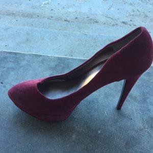 New condition. Never worn. Guess brand deep dark purple velvet heels. Silver insole. Size 8.5 medium width.
