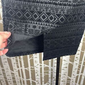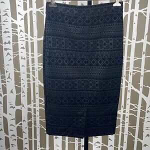 Iris Tribal Print Black Velvet Burnout Pencil Skirt size M. Features stretchy velvet burnout fabric with an allover geometric pattern, back center slit on hemline, pull-on elastic waistband. The texture of the fabric feels so nice! Gently worn and laundered with no flaws to note.
