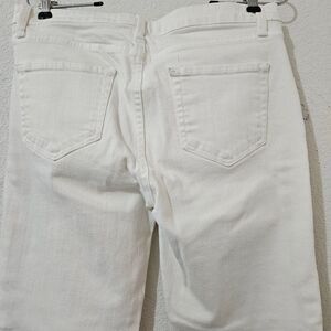 Fit: sets on the waistline, straight leg, cropped length with a frayed hem, and a slight flare from the knee down.
