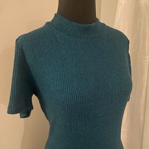 Never been worn, color is a peacock blue/green with black. Luxe ribbing textures the silhouette of this versatile short sleeve Fit and Flare dress that can be dressed up or down for all occasions.