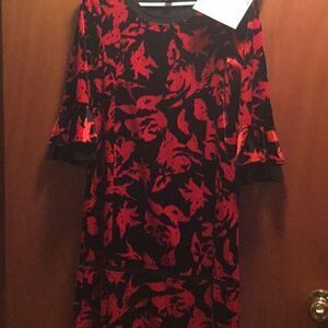 A real cutie! This is NWOT dress from RABBIT DESIGNS. Colors are bright red & black in a velvet feeling material. Pull on design with 3/4 length sleeves, little see thru lace insert above the hem in black. Simple shift design. Little bell flare to sleeves. Measurements are as follows: bust 36”, waist 36”, hips 38”, sleeve length 17”, dress length 36”.