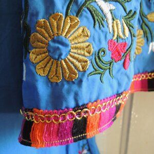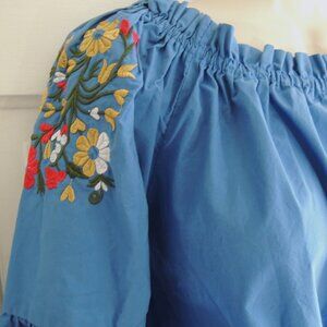 Velzera royal blue embroidered mini dress or tunic, size Small. Royal blue cotton peasant-style dress (or wear as tunic) has a wide, elasticized, paper bag-style neckline that can be worn on- or off-shoulder. Bell sleeves and lower portion of garment are heavily embroidered in vibrant white, red, gold & green floral pattern. Sleeves and hem are edged with orange, magenta & black trim, with gold thread accent. Back is plain. Relaxed fit, festive and summery, with an ethnic boho vibe. EUC.