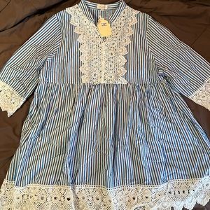 Velzera Turquoise & Navy striped tunic w/white lace 1XL. Could be worn as a short dress or tunic with leggings underneath. Purchased for a reimagined Alice for Disneybounding but could also be cute for a baby shower.