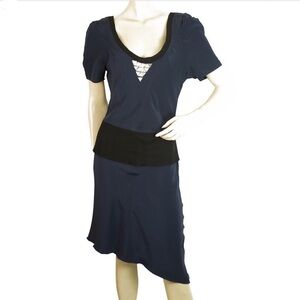 Beautiful Vena Cava Blue Color w. Black Trim Asymmetrical Length Silk Dress. Features short sleeve length, front Seaming, front and back Scoop Neckline, Embellished Detailing in Silver Toned Hardware and a contrast trim / peplum.