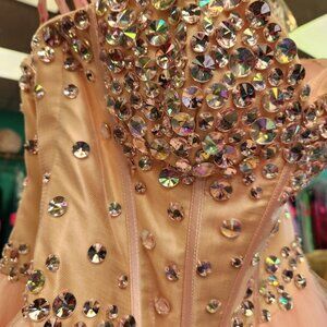 Sweetheart neckline, encrusted beading on a corset bodice with a tulle Ballgown skirt.