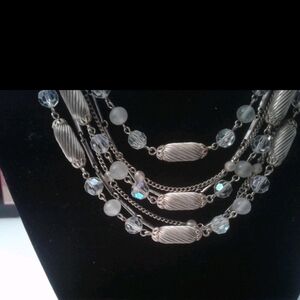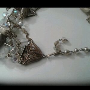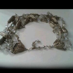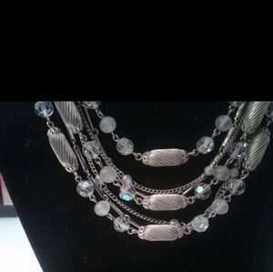 This exquisite vintage Vendome necklace features an elegant five-strand design, showcasing a sophisticated mix of textured goldtone oval beads, shimmering crystal faceted beads, frosted glass beads, and delicate goldtone link chains. The strands are artfully layered to create a graceful drape, catching the light beautifully with every movement.