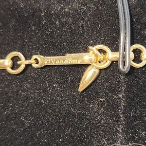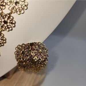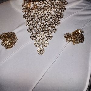 This signed Vendome mesh bib necklace and clip-on earrings set are both delicate and elegant. The pieces have a bright, unblemished glossy gold tone finish.