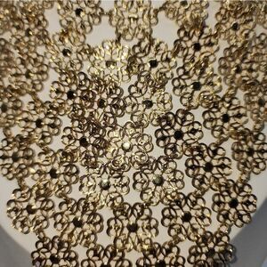 The necklace is 14" with a hook clasp and is made of delicate flower-like disks forming a mesh V shape bib. The bib is 51/2" long.