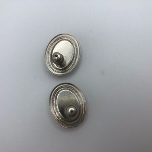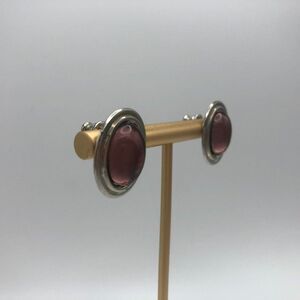 Vintage Vendome silver tone oval shaped earrings featuring central amethyst colored clear cabochons. Post backs. Stones measure 10 x 19 mm. Earrings overall measure approximately 3/4 x 5/8 inches and weigh 5 grams. New on original card.