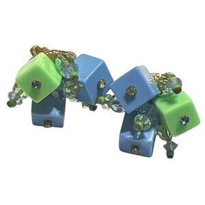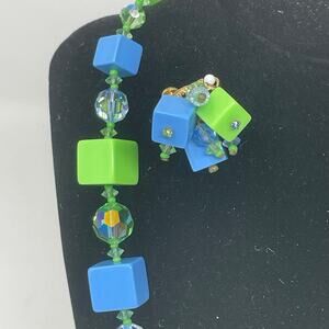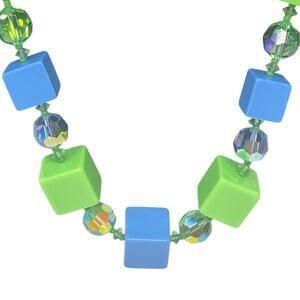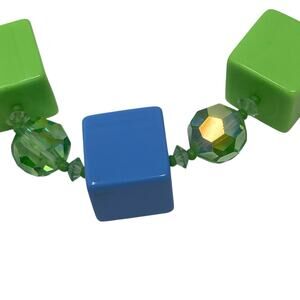 Graduated lime green and blue solid lucite cubes interspersed with blue and green crystals and tiny green crystal spacers