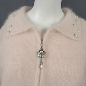 Luxuriously soft blush-pink Venesha angora zip cardigan with full satin lining and dazzling pearl and rhinestone embellishments. The sparkling cross zipper pull and jeweled collar elevate this timeless piece into statement knitwear perfection. Made from an 80 % angora / 20 % nylon blend, this fuzzy sweater feels incredibly plush and feminine while maintaining structure through its lining. Perfect for dressy winter gatherings, vintage-inspired wardrobes, or soft romantic outfits. Has quiet luxury vibes.