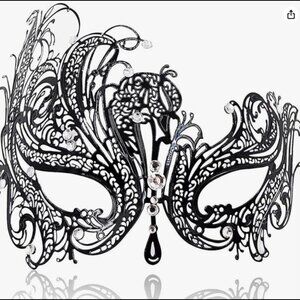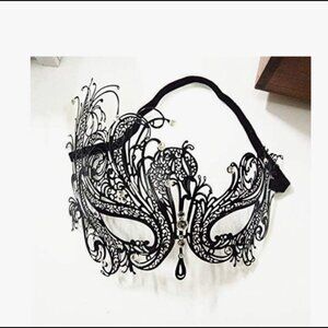 Hand-made laser metal cut craft and lightweight materials for comfortable wear. Black Venetian style with bright diamante crystal detailing.