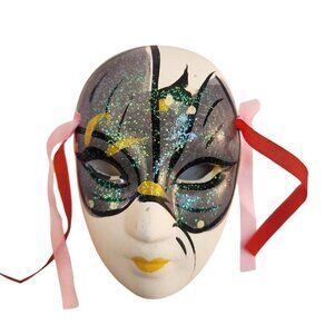 This set features three Venetian-style hand-painted wall masks, beautifully accented with intricate butterfly designs and glitter details. Each mask is crafted with unique artwork and features a ribbon tie for optional hanging display. The bold designs include vibrant colors with glossy glitter accents for added sparkle. These lightweight masks are perfect for wall decoration or as striking art installations. Their butterfly-inspired patterns, combined with an artistic aesthetic, make them versatile for themed events or decorative purposes.