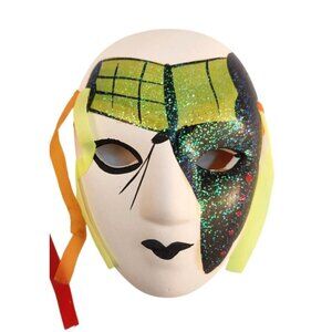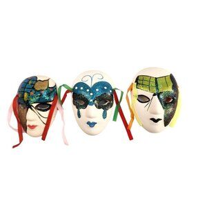 This set of three handcrafted ceramic mini wall masks adds a touch of Venetian elegance to any space. Each mask showcases unique colorful glitter accents and vibrant ribbons, making them eye-catching decorative pieces. Their lightweight design allows for easy wall mounting, enhancing interior aesthetics while paying homage to traditional Venetian artistry.