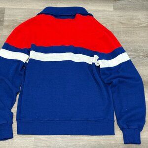 Retro vibes meet timeless style with this bold vintage sweater jacket. Features a striking red, white, and blue colorblock design with a full zip front, stand collar, and contrasting front pockets. Soft acrylic knit with ribbed cuffs and waistband for a comfortable fit.