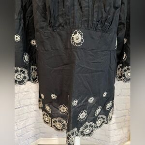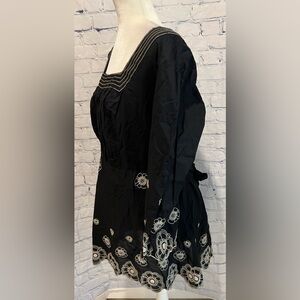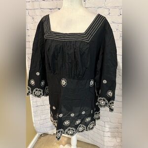 This beautiful black and white floral embroidered blouse from Venezia is the perfect addition to any wardrobe. The lightweight cotton material makes it ideal for any season, while the short sleeves add a touch of elegance. The blouse is designed with a plus size type and fits a size 26/28. It features a stunning floral pattern that is sure to turn heads. 27 inches pit to pit and 32 inches long. Smoke-free home.