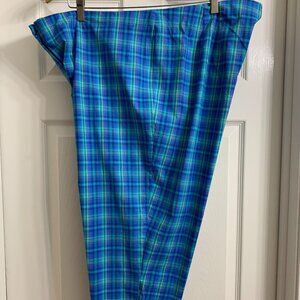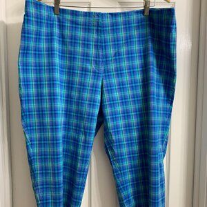 Very cute capri pants in excellent condition. The colors in these pants is blue, green, light purple. These pants have splits on each side of the leg. Front zipper with button and hook closure. Size 24. Material is 97% cotton, 3% spandex. Smoke free/pet free home.