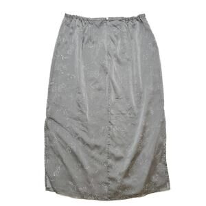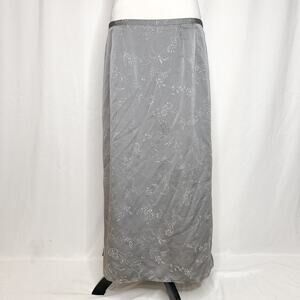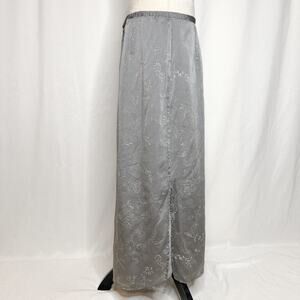 Long A Line skirt is a sheer gray with linear flower design over a solid gray lining. Waist has some stretch. Zipper / button closure. Has side slits. Vintage 1990s.