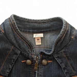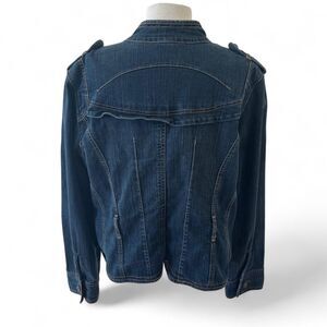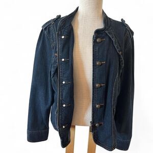 Super unique denim jacket with a structured, military-style design! Features decorative metal buttons down the front, shoulder epaulets, and contrast stitching. has a flattering shape and curved hem at the bottom.