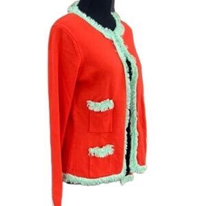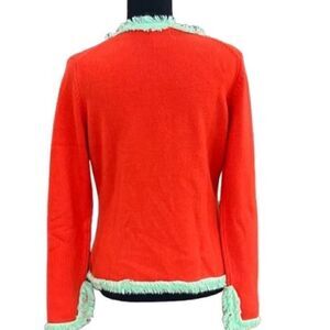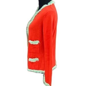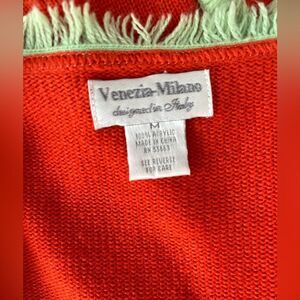Venezia- Milano orange/ green fringe sweater/ jacket, size M. 100% acrylic, orange knit with light green fringe trim. Open front with hook and eye closure at neckline, no buttons. 4 small patch pockets in front, hook and eye closure at neckline. Approximate measurements are pit to pit 19”, length from shoulder approximately 23”.