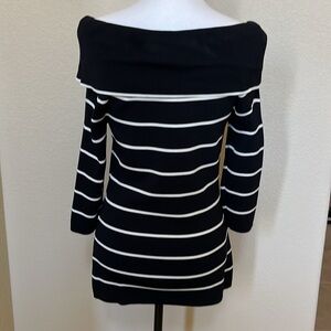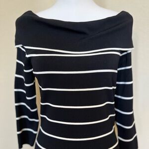 Classic Venini black and white striped boatneck off the shoulder sweater. Features 3/4” sleeves and is a perfect spring or summer wardrobe essential!