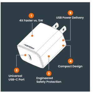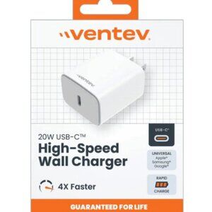 Ventev Wall Charger 1 Port 20 Watt USB-C Ultrafast Power Box in Retail Box White. USB-C Cable not included.