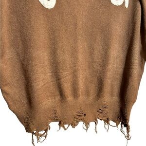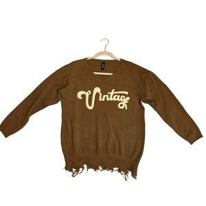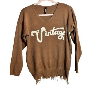 Venti6 Long Sleeve VNeck Sweater Distressed Hem Vintage Logo Brown Grunge Medium