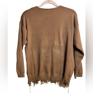 Venti6 Italian made, trendy v-neck, 3/4 length sleeve, distressed raw edge hem, textured Vintage appliqué, dark camel/brown colored soft, cozy sweater.