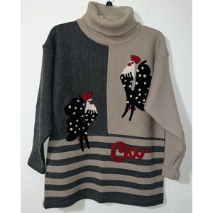 Ventilo Brown Gray Turtleneck Sweater with Roosters (Chenille) Medium
