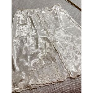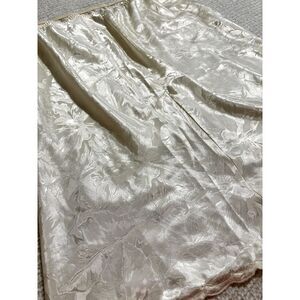 Vintage Ventura satin slip skirt in ivory, size 2X. Features a floral jacquard finish with scalloped lace trim and an elastic waist for a comfortable, flattering fit. Soft, silky drape makes it perfect worn as a slip, styled as a coquette skirt, or layered for modern lingerie-inspired outfits. No flaws noted. Harder-to-find plus size.
