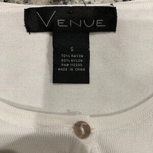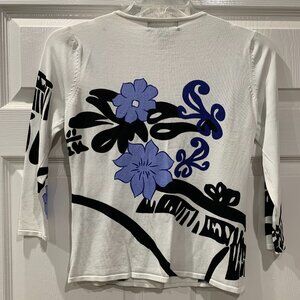 Very pretty white sweater in excellent condition. This sweater has a blue and black flower design. Sequins on the flowers as well. Size small. Material is 70% rayon, 30% nylon. Full front button-down closure. Smoke free/pet free home.